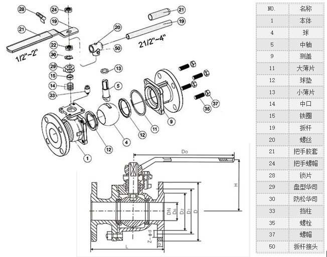 Q41F Manual Flange Cast Steel Ball Valve Structure Diagram and Connection Dimensions