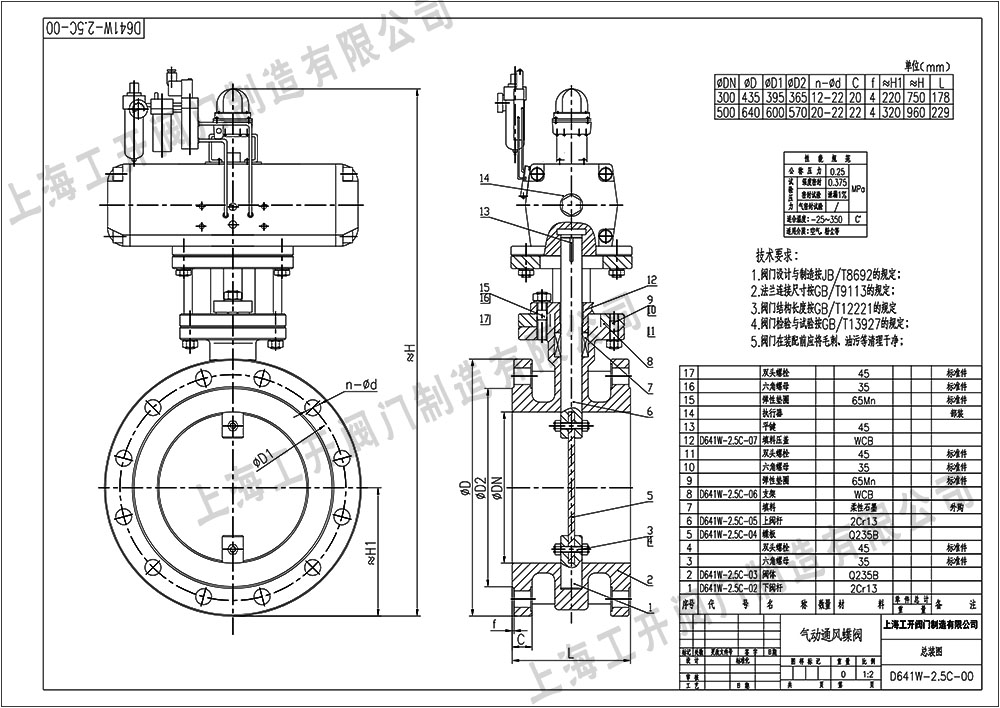 氣動通風蝶閥圖紙D641W-2.5C-DN300-DN500