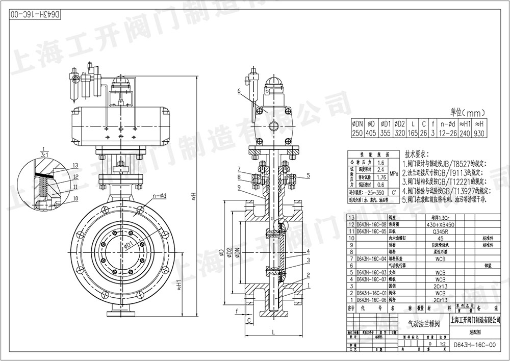 氣動(dòng)蝶閥D643H-16C-DN250蝶閥圖紙