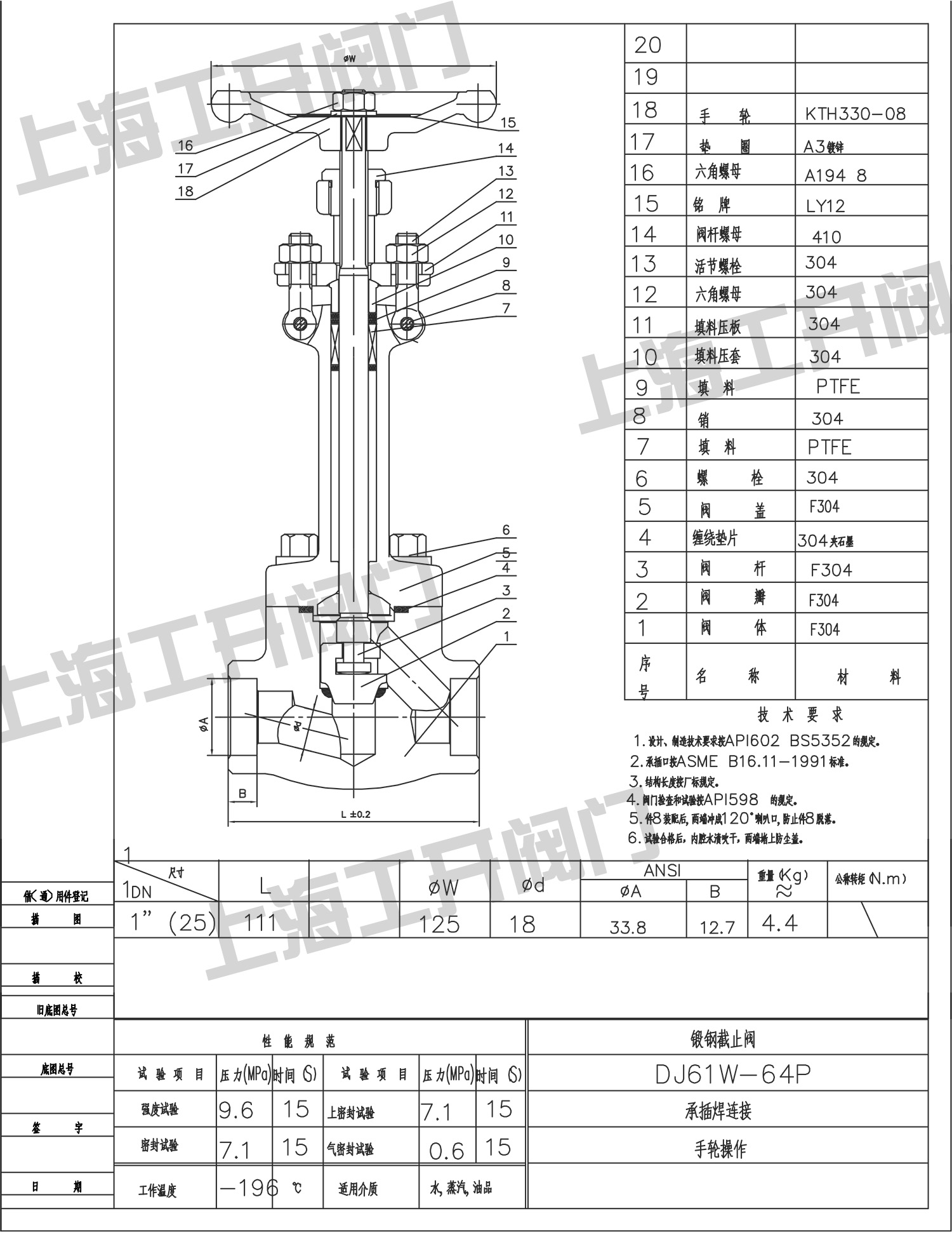 DJ61W-64P-DN25低溫鍛鋼截止閥圖紙
