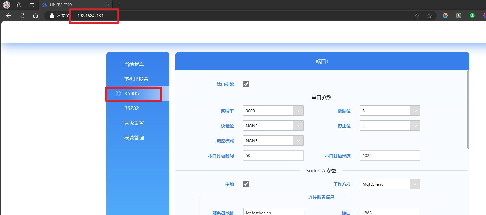 如果設(shè)備IP沒有更改,在瀏覽器輸入 192.168.1.200,如果更改了,則輸入更改后的IP地址,示例圖如下:(PS:這里的RS485配置參數(shù),要跟子設(shè)備仿真軟件配置的一致)